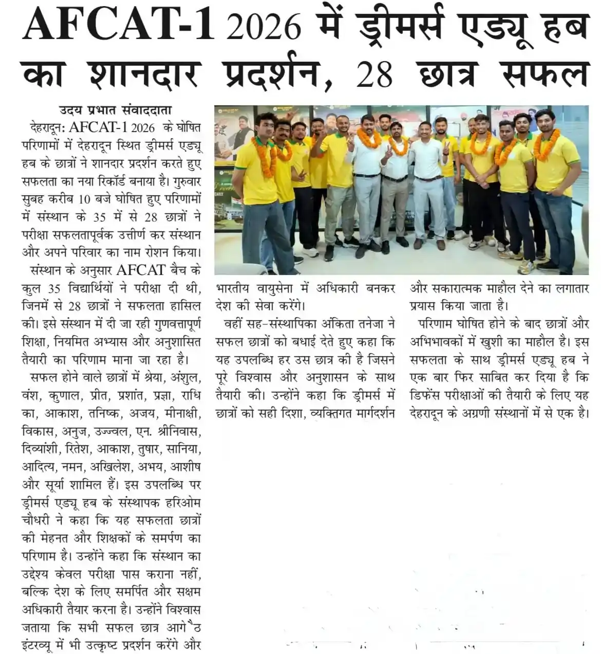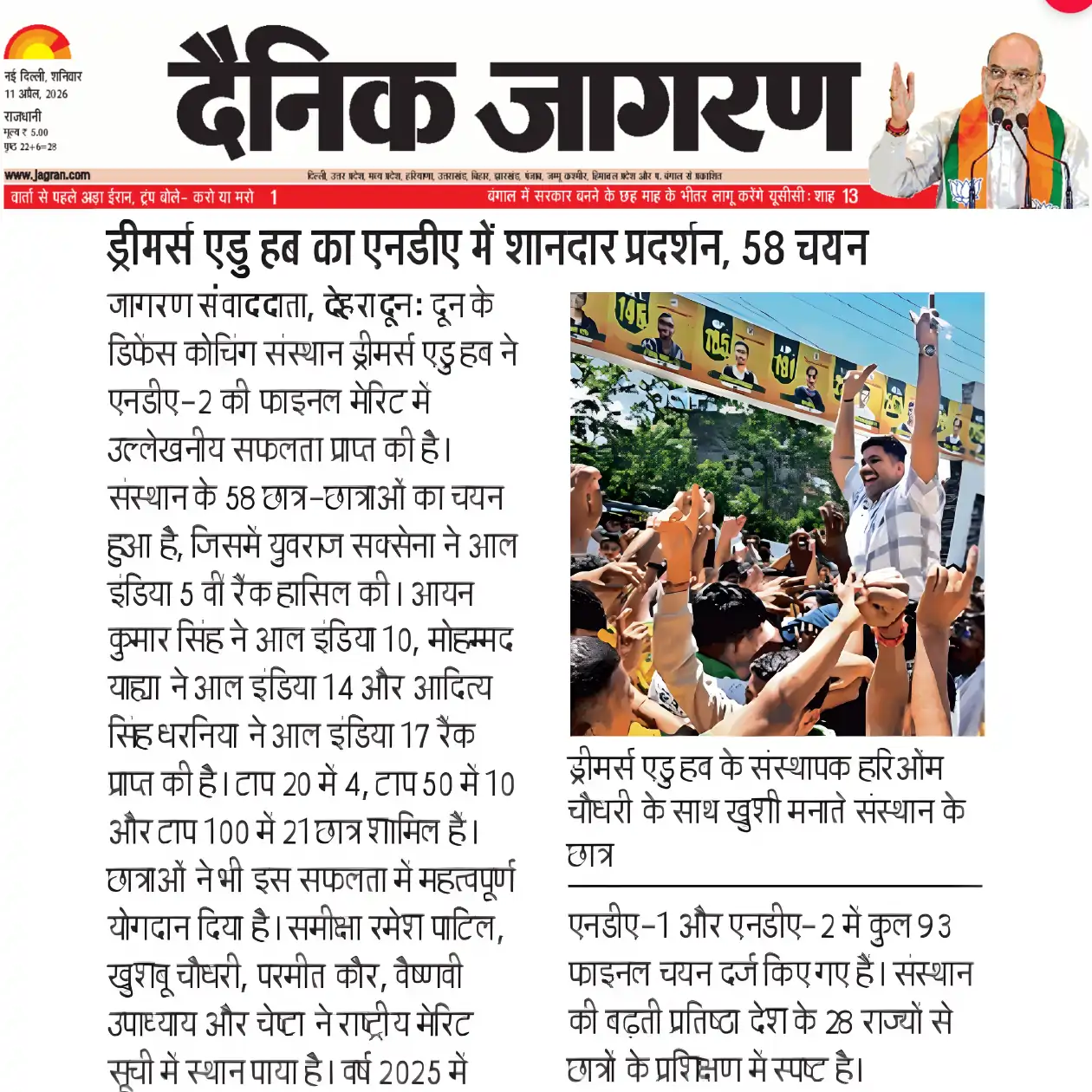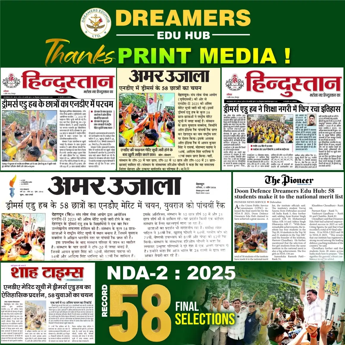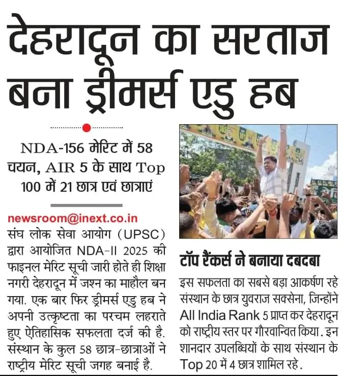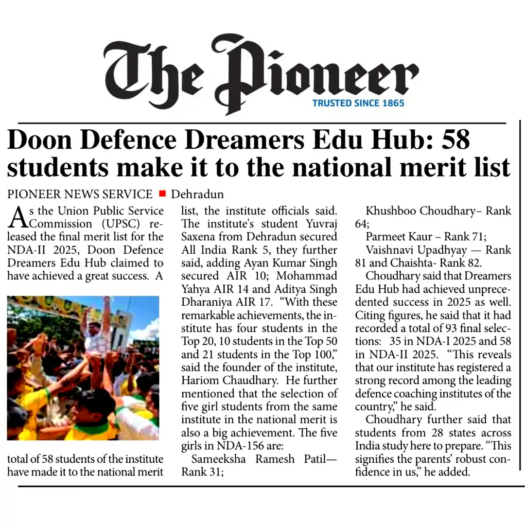 Doon Defence Dreamers (Dreamers Edu Hub) has been consistently featured in leading national and regional newspapers for its outstanding defence exam results. Our students’ selections in NDA, CDS, AFCAT, SSB, and Sainik School exams have been covered by Dainik Jagran, Amar Ujala, Hindustan, The Pioneer, Shah Times, and iNext among others. Beyond print media, Doon Defence Dreamers has been featured in prominent digital publications including Forbes India, The Tribune, Republic World, The Wire, The Print, Zee News, YourStory, The Quint, and BusinessWorld. From record-breaking 14 SSB recommendations in a single day to 93 final NDA selections and 710+ written qualifiers, our achievements reflect the hard work of our cadets and the dedicated guidance of our faculty. This page showcases our media coverage — a testament to the trust and recognition Doon Defence Dreamers has earned as Dehradun’s premier defence coaching institute.