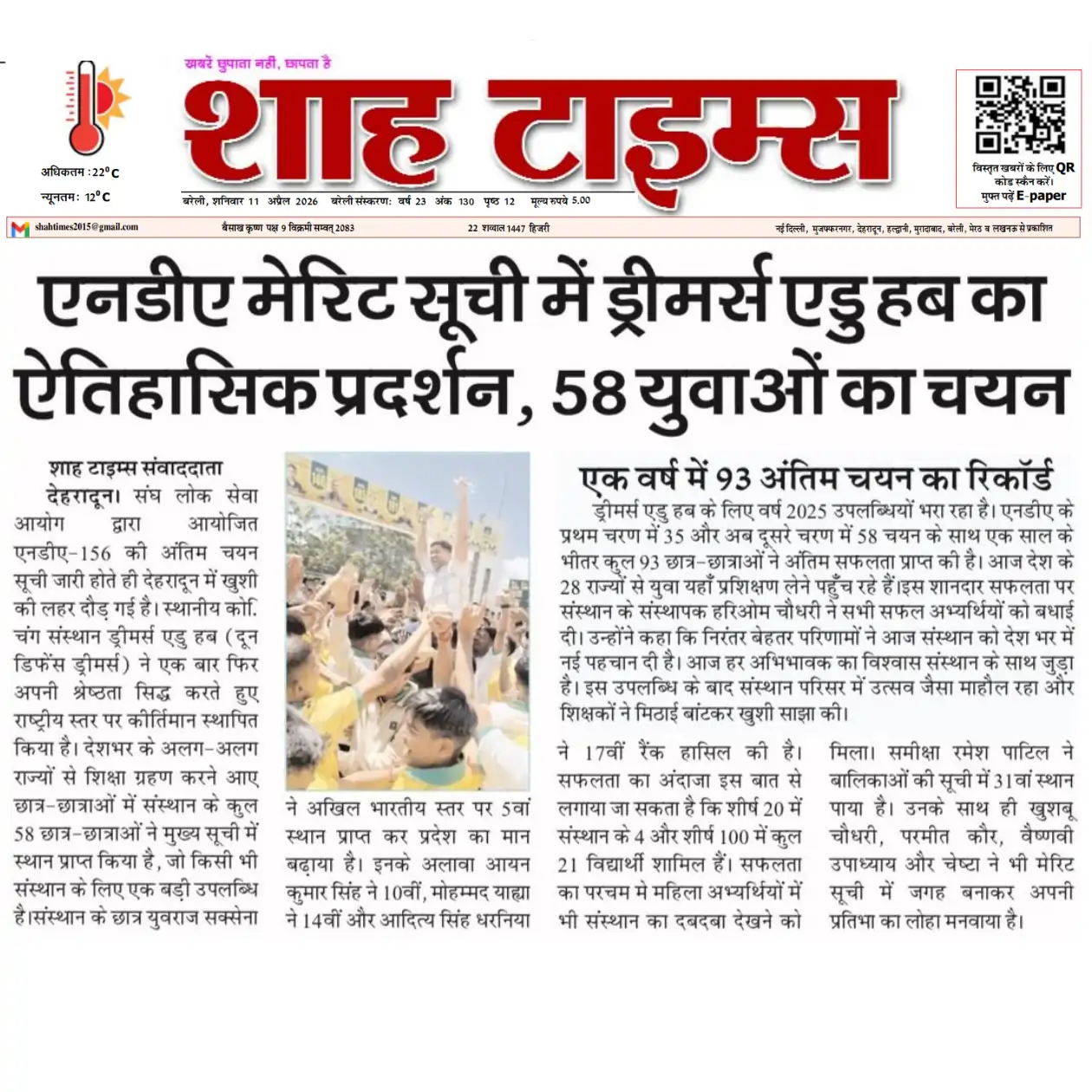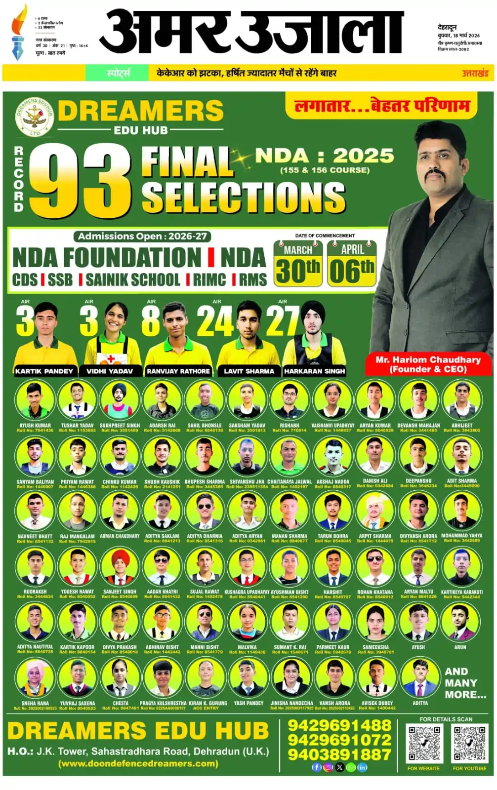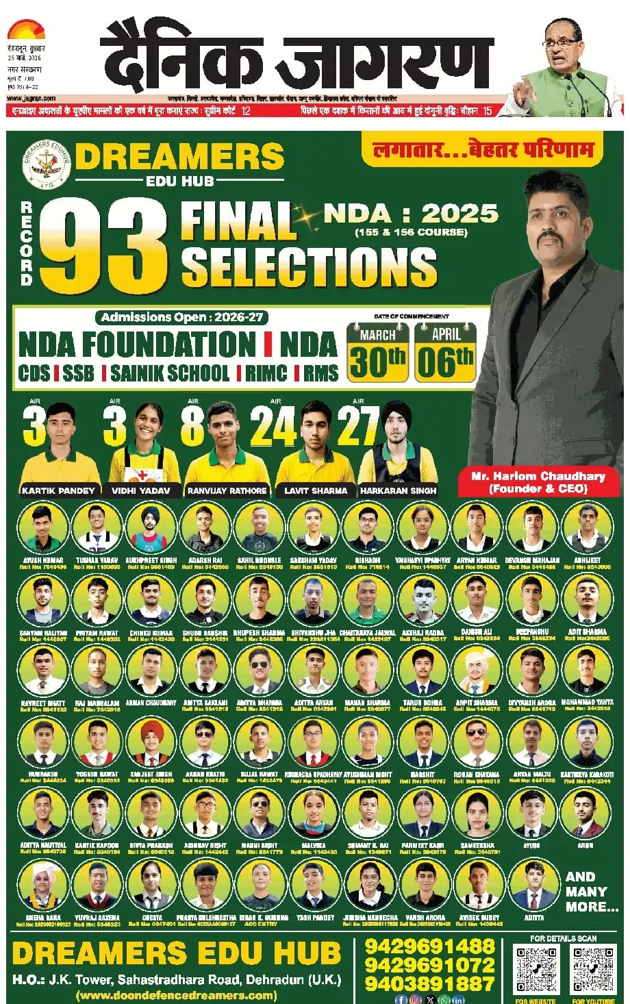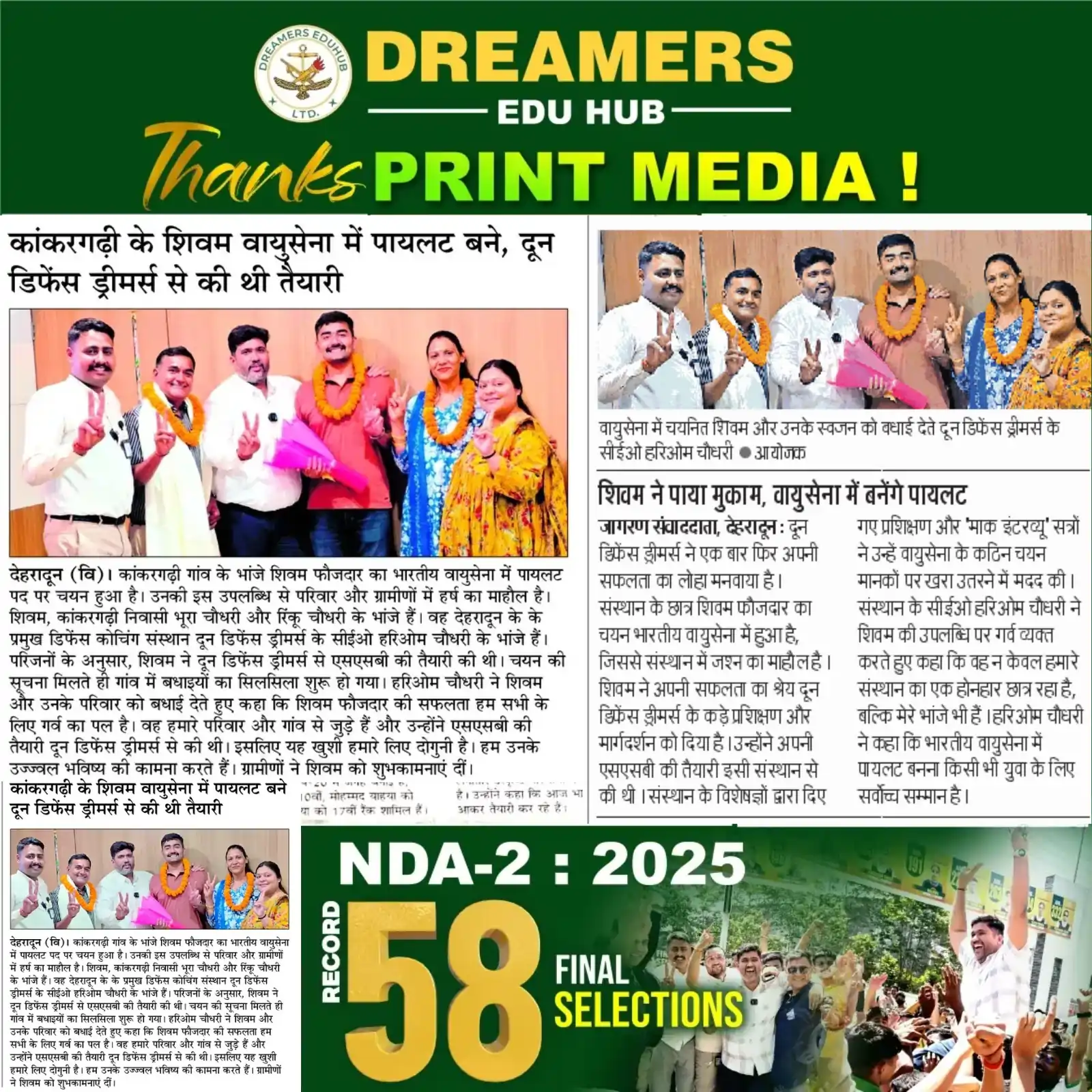 Doon Defence Dreamers (Dreamers Edu Hub) has been consistently featured in leading national and regional newspapers for its outstanding defence exam results. Our students’ selections in NDA, CDS, AFCAT, SSB, and Sainik School exams have been covered by Dainik Jagran, Amar Ujala, Hindustan, The Pioneer, Shah Times, and iNext among others. Beyond print media, Doon Defence Dreamers has been featured in prominent digital publications including Forbes India, The Tribune, Republic World, The Wire, The Print, Zee News, YourStory, The Quint, and BusinessWorld. From record-breaking 14 SSB recommendations in a single day to 93 final NDA selections and 710+ written qualifiers, our achievements reflect the hard work of our cadets and the dedicated guidance of our faculty. This page showcases our media coverage — a testament to the trust and recognition Doon Defence Dreamers has earned as Dehradun’s premier defence coaching institute.